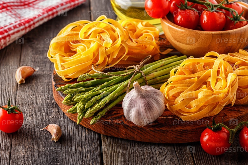 Продукты для приготовления пищи - свежая спаржа, макаронные изделия, оливковое масло