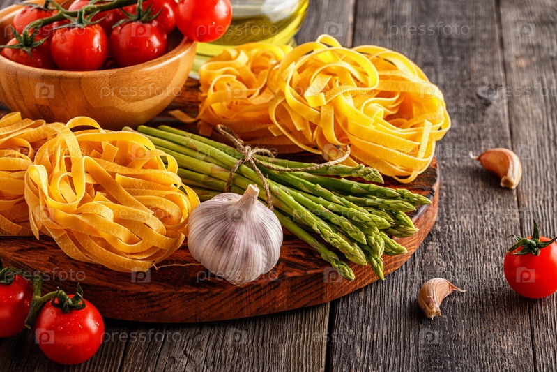 Продукты для приготовления пищи - свежая спаржа, макаронные изделия, оливковое масло