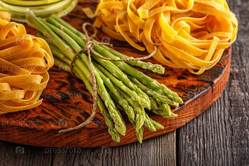 Продукты для приготовления пищи - свежая спаржа, макаронные изделия, оливковое масло