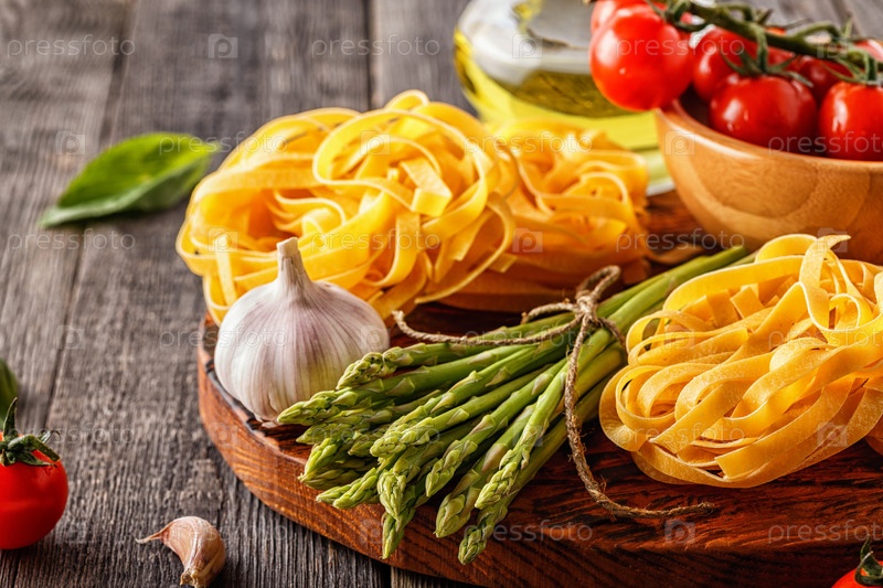 Продукты для приготовления пищи - свежая спаржа, макаронные изделия, оливковое масло