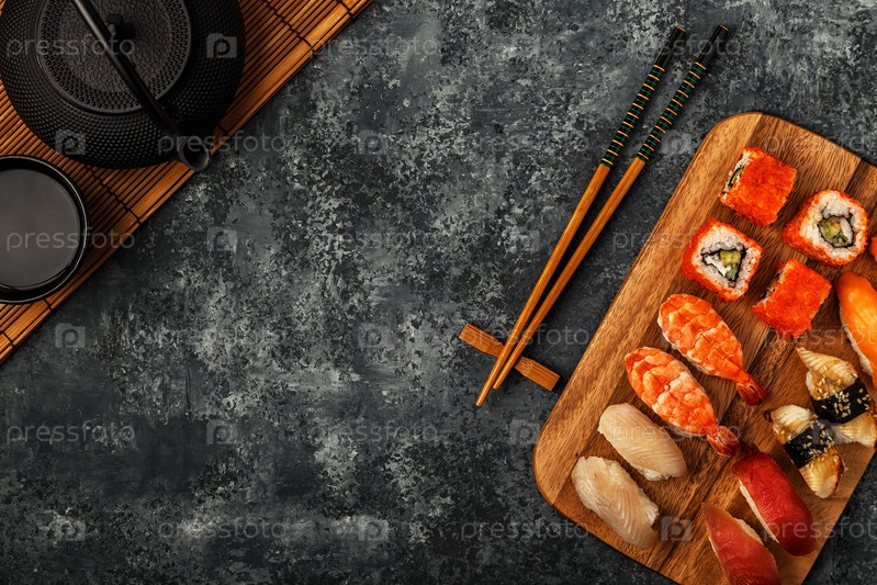 Суши-сет: суши и суши-роллы на деревянной тарелке