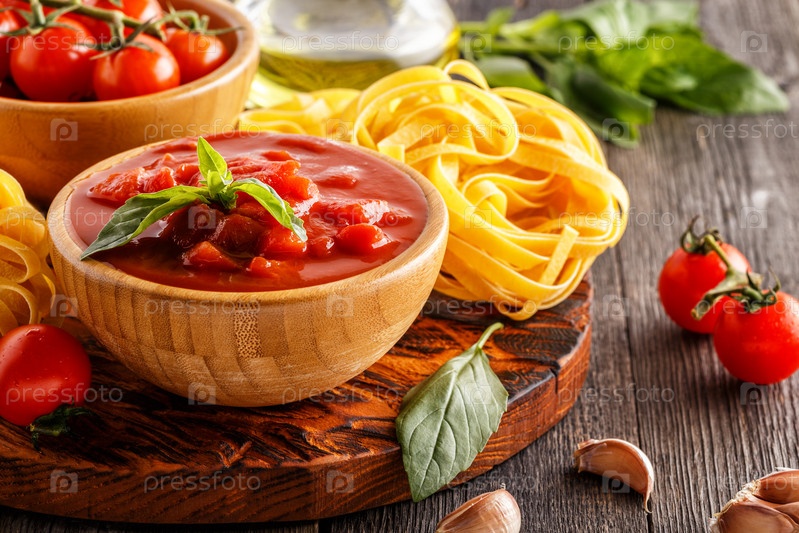 Продукты для приготовления - томатный соус, макароны, помидоры, чеснок, оливковое масло