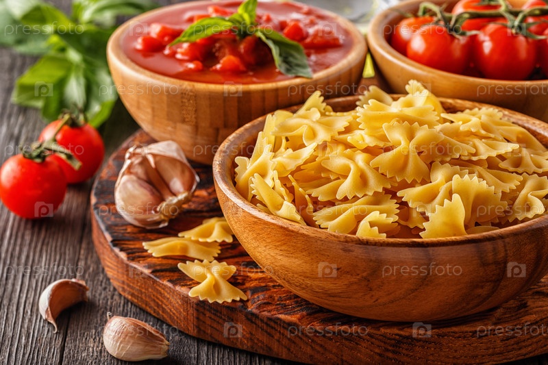 Продукты для приготовления - макароны, помидоры, чеснок, оливковое масло, томатный соус