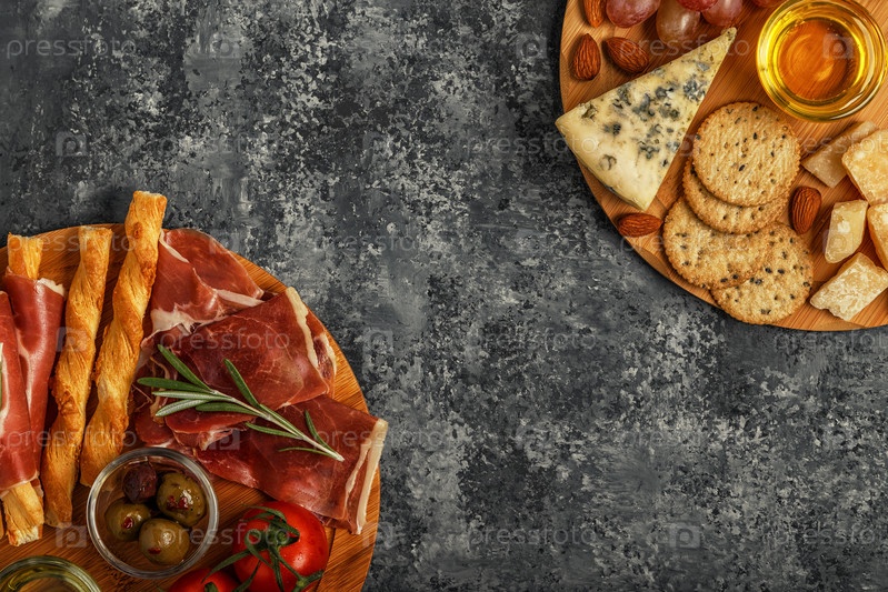 Выбор закусок из сыра и мяса, вид сверху