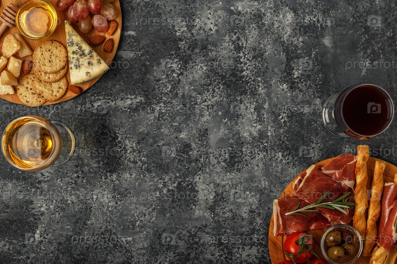 Выбор закусок из сыра и мяса, вид сверху