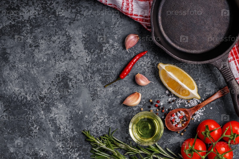 Фон со специями, травами, оливковым маслом и сковородой для приготовления пищи