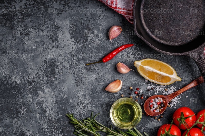 Фон со специями, травами, оливковым маслом и сковородой для приготовления пищи