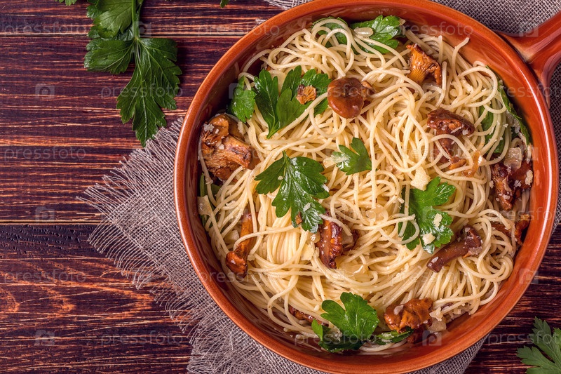 Паста спагетти с грибами лисички на деревянном фоне