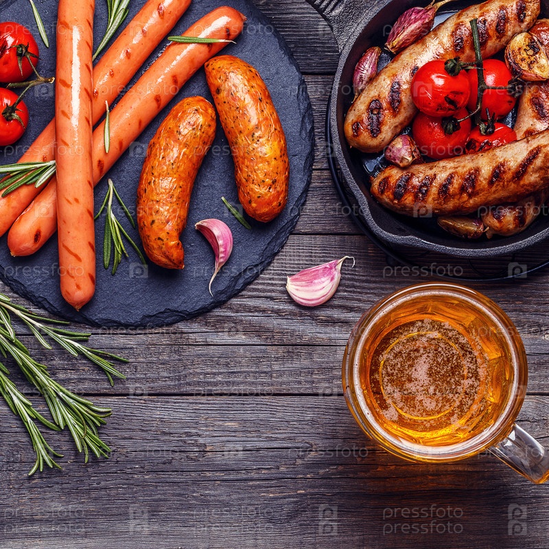 Жареные сосиски со стаканом пива на деревянном столе