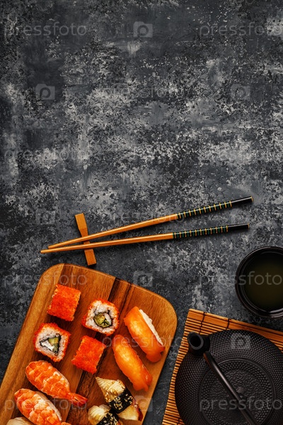 Суши-сет: суши и суши-роллы на деревянной тарелке
