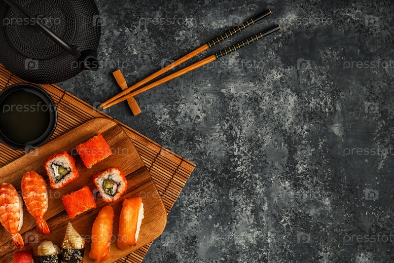 Суши-сет: суши и суши-роллы на деревянной тарелке