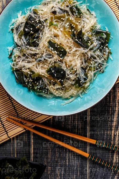 Салат из фунчозы с вакаме на темном фоне