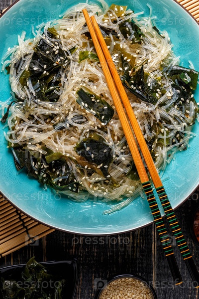 Салат из фунчозы с вакаме на темном фоне