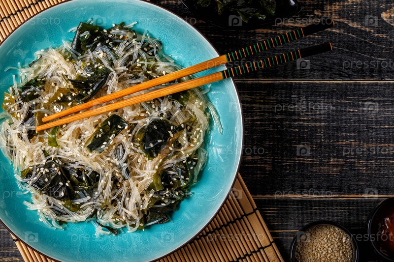 Салат из фунчозы с вакаме на темном фоне