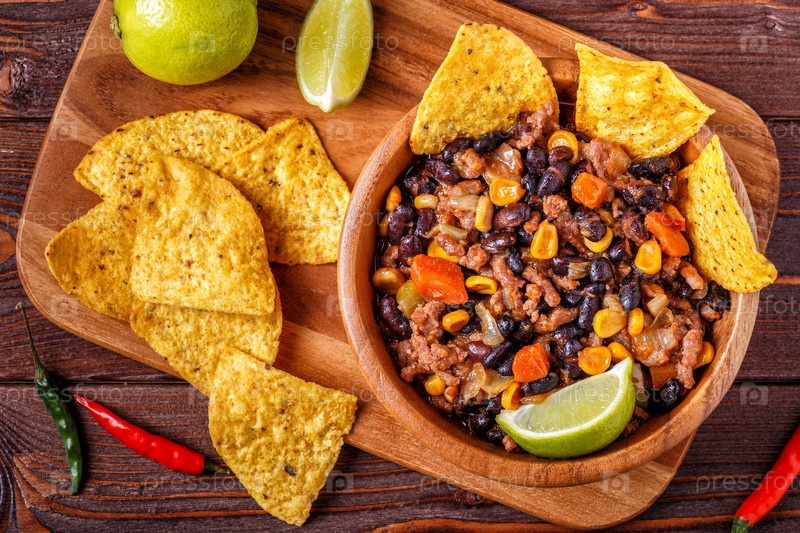 Чили кон карне в миске с чипсами из тортильи