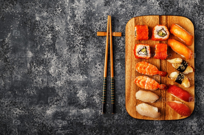 Суши-сет: суши и суши-роллы на деревянной тарелке