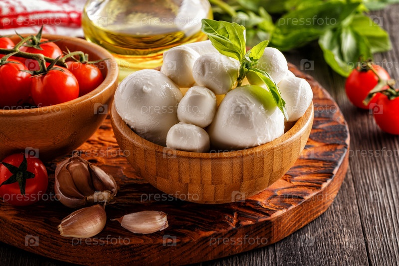 Ингредиенты для приготовления - сыр моцарелла, помидоры, базилик, чеснок, оливковое масло