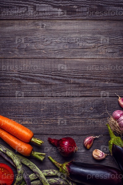 Свежие овощи для приготовления пищи на темном деревянном фоне с местом для текста