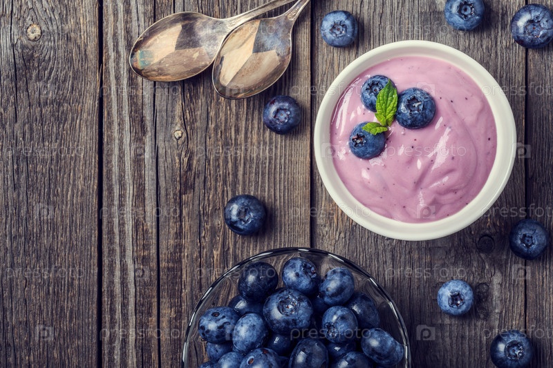 Домашний йогурт со свежей черникой на деревянном фоне