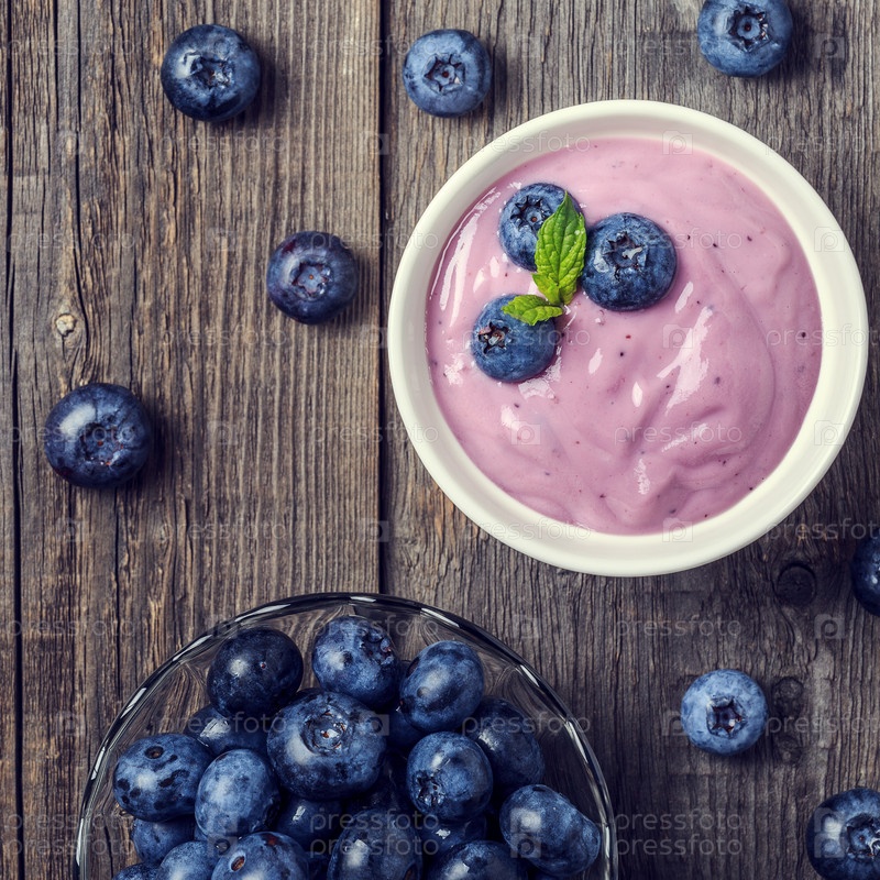 Домашний йогурт со свежей черникой на деревянном фоне
