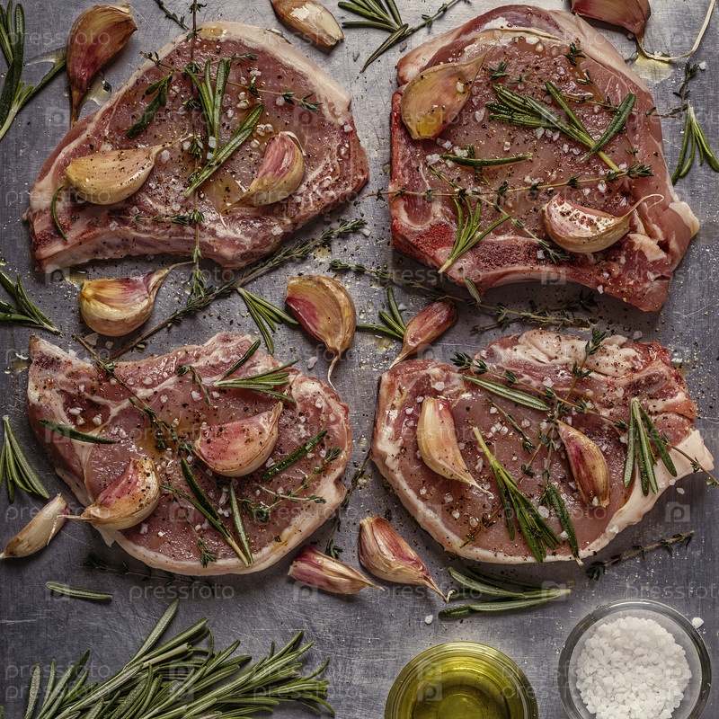 Сырые свиные отбивные со специями на металлическом противне