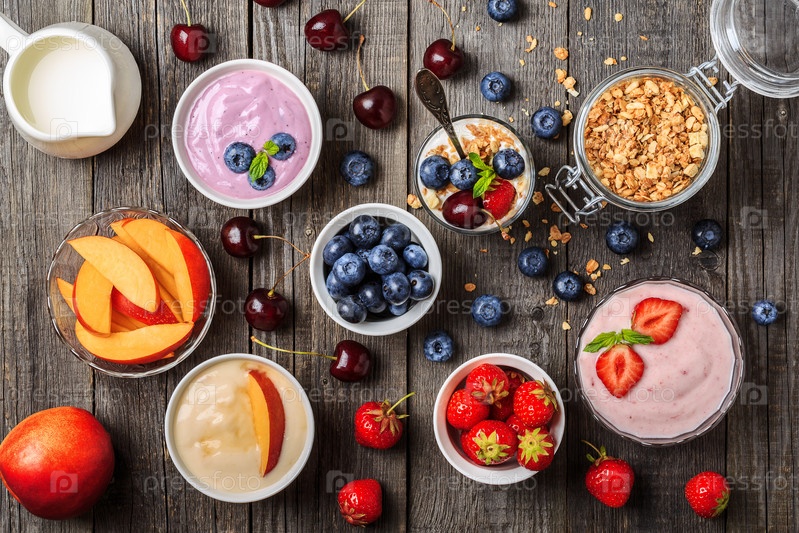 Домашний йогурт со свежей клубникой, черникой, персиком на деревянном фоне
