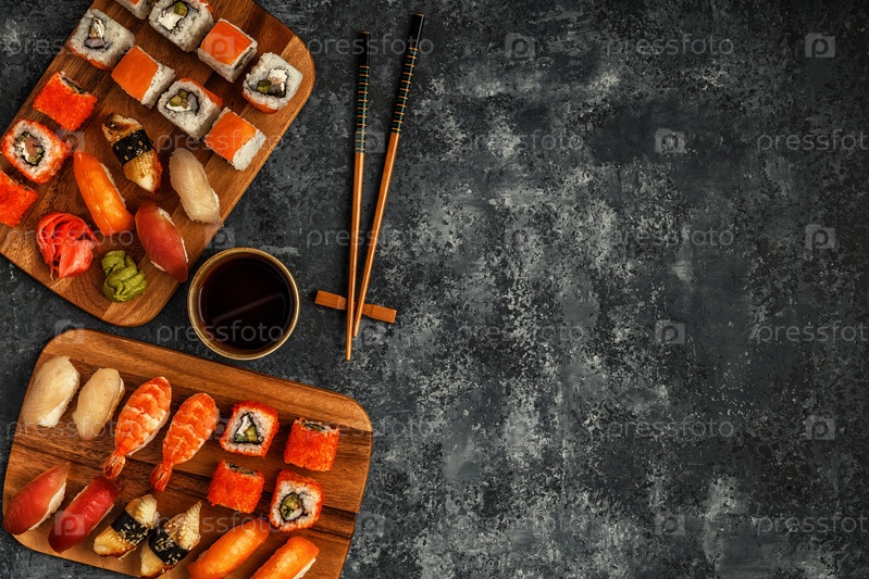 Суши-сет: суши и суши-роллы на деревянной тарелке