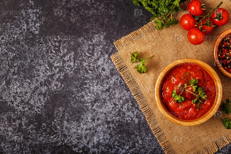 Томатный соус с чесноком и петрушкой в деревянной миске