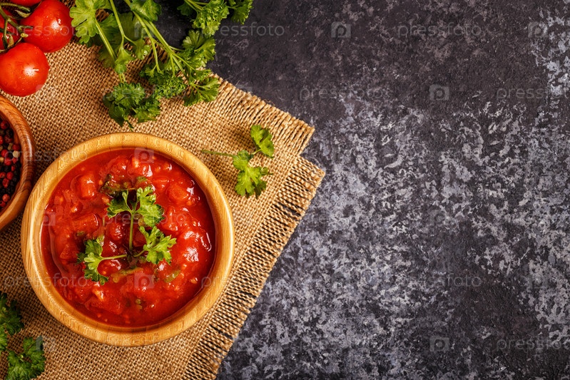 Томатный соус с чесноком и петрушкой в деревянной миске