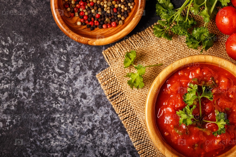 Томатный соус с чесноком и петрушкой в деревянной миске
