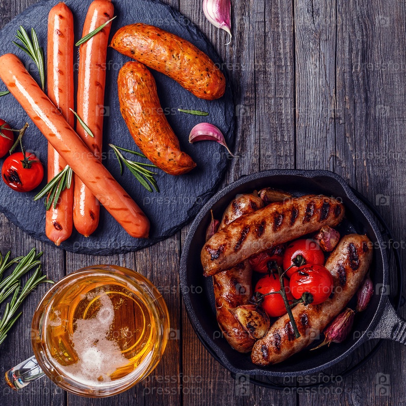 Жареные сосиски со стаканом пива на деревянном столе