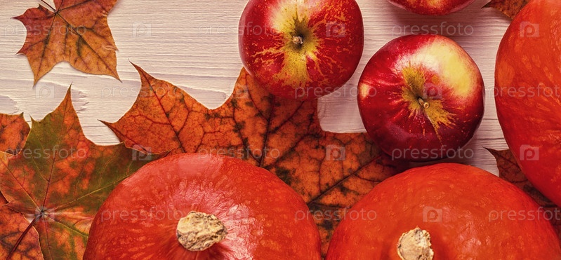 Осенний фон с цветными листьями и тыквами на деревянном фоне
