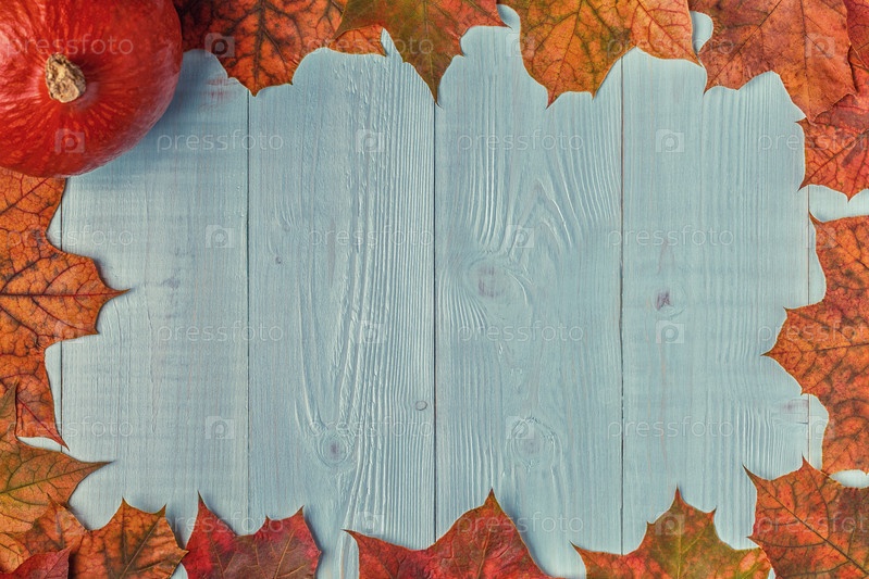 Осенний фон с цветными листьями и тыквами на деревянном фоне