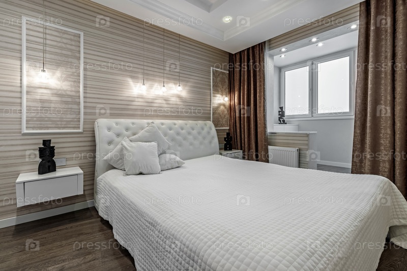 Светлая спальня с большой белой кроватью и изголовьем капитоне