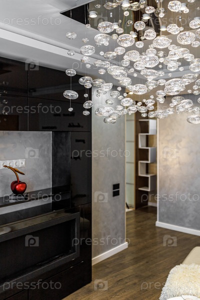Черный биокамин в гостиной с большой хрустальной люстрой в квартире
