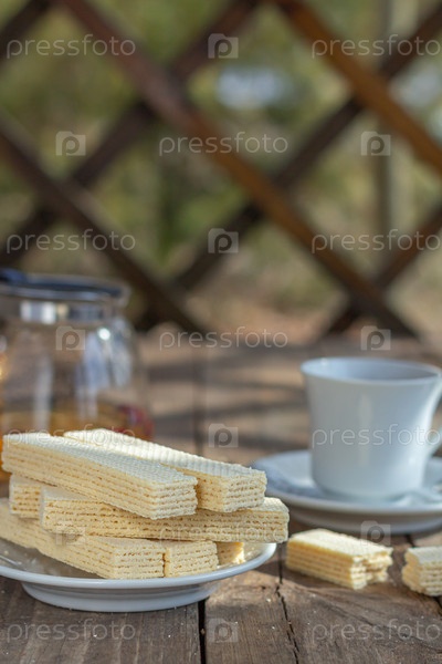 Чаепитие со сладкими русскими вафлями на деревянном фоне. Традиционные сладости и десерт
