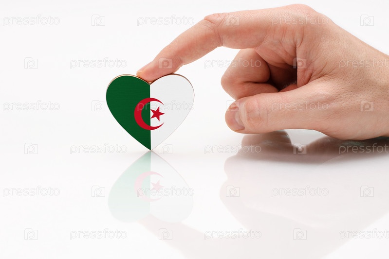 Флаг Алжира. Любите и уважайте Алжир. Мужская рука держит сердце в форме флага Алжира на поверхности белого стекла. Концепция патриотизма и туризма