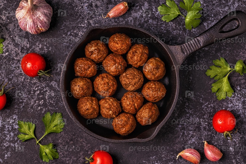 Жареные фрикадельки с помидорами, чесноком и петрушкой