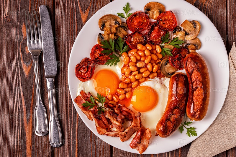 Традиционный полный английский завтрак с яичницей, сосисками, фасолью, грибами, помидорами на гриле и беконом на деревянном фоне