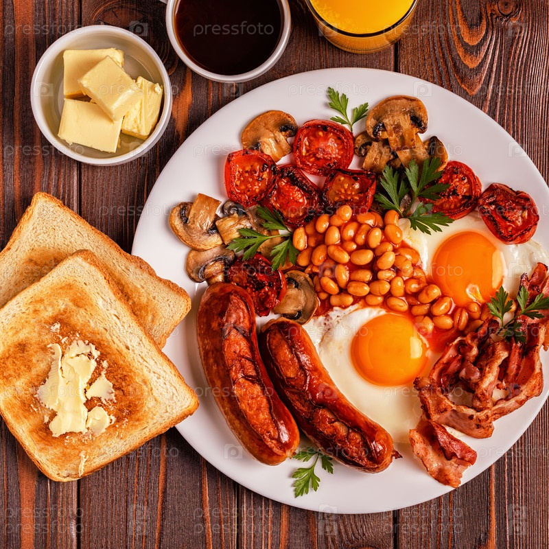 Традиционный полный английский завтрак с яичницей, сосисками, фасолью, грибами, помидорами на гриле и беконом на деревянном фоне