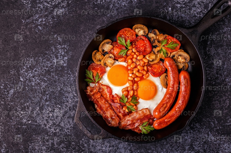 Традиционный полный английский завтрак с яичницей, сосисками, фасолью, грибами, помидорами на гриле и беконом