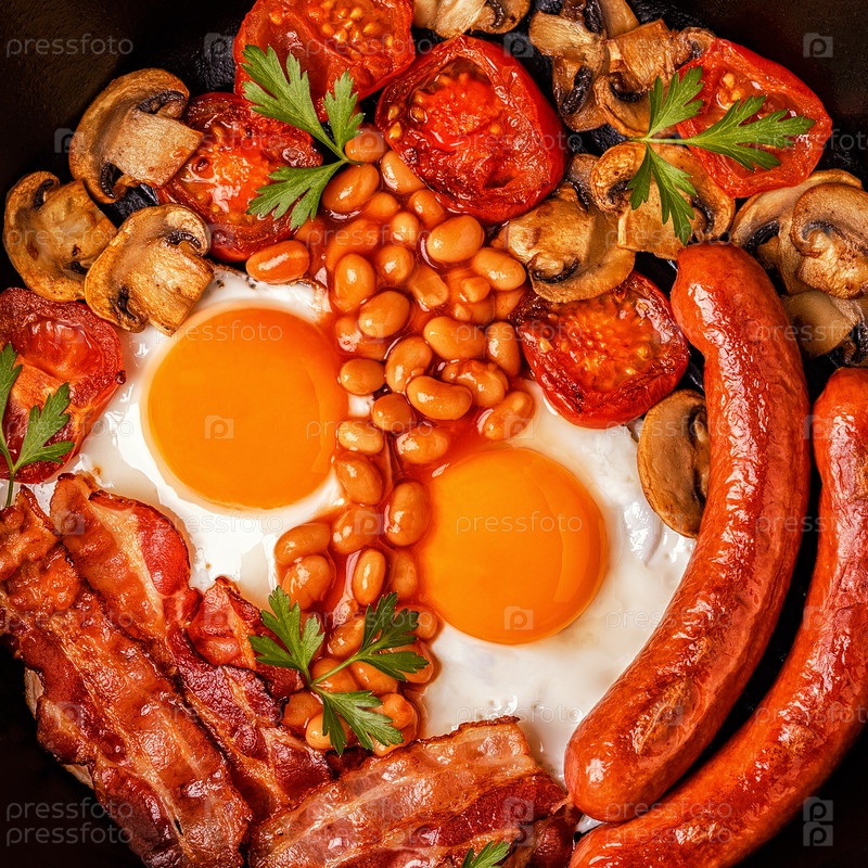 Традиционный полный английский завтрак с яичницей, сосисками, фасолью, грибами, помидорами на гриле и беконом