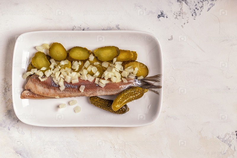 Традиционная голландская сырая сельдь с луком и солеными огурцами