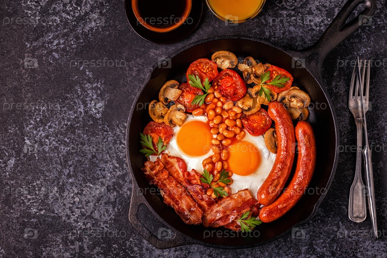 Традиционный полный английский завтрак с яичницей, сосисками, фасолью, грибами, помидорами на гриле и беконом