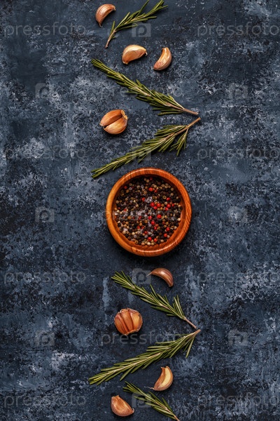 Темный пищевой фон с розмарином, чесноком и перцем
