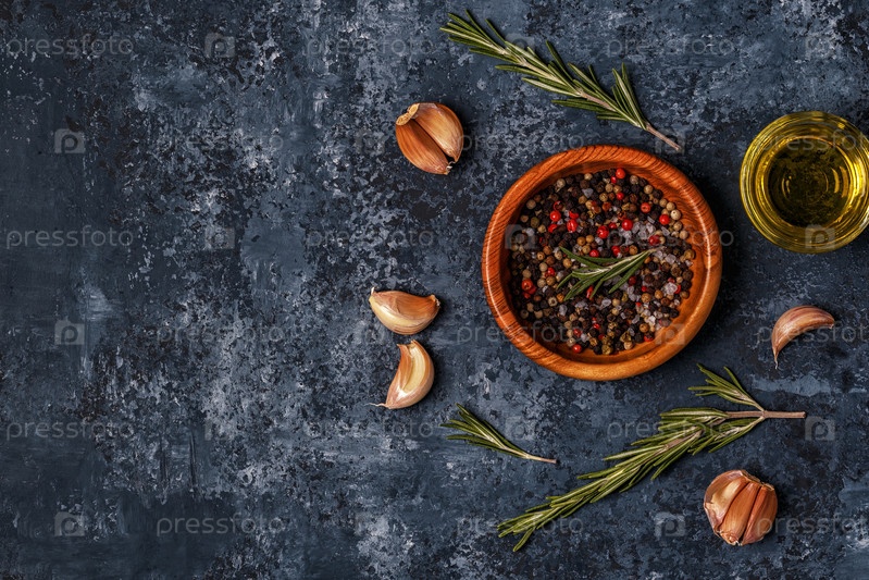 Темный пищевой фон с розмарином, чесноком и перцем