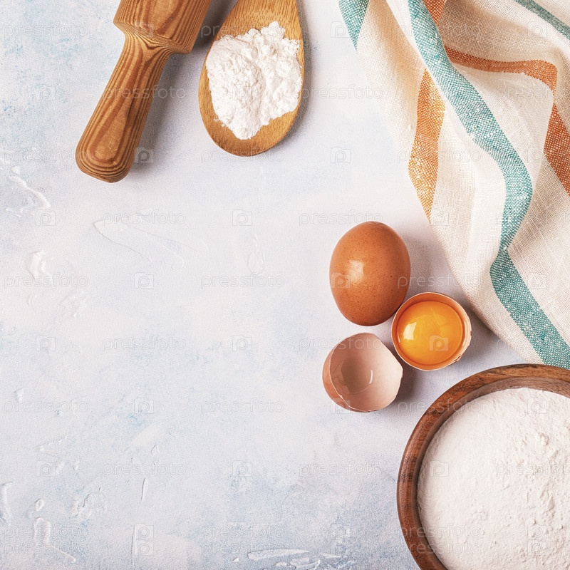 Ингредиенты для выпечки - мука, деревянная ложка, яйца