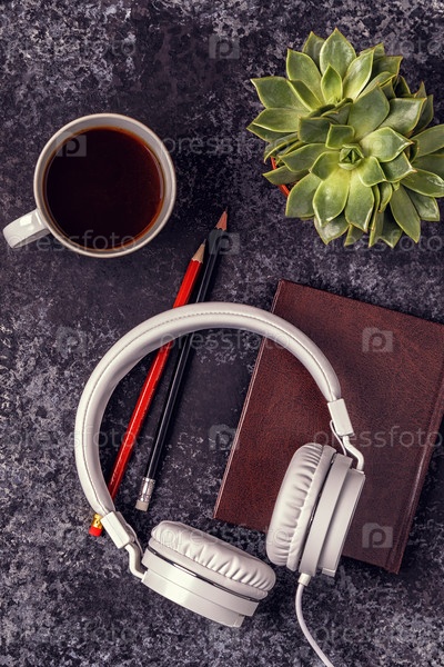 Стол с блокнотом, наушниками и кофе
