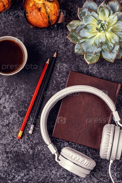 Стол с блокнотом, наушниками и кофе