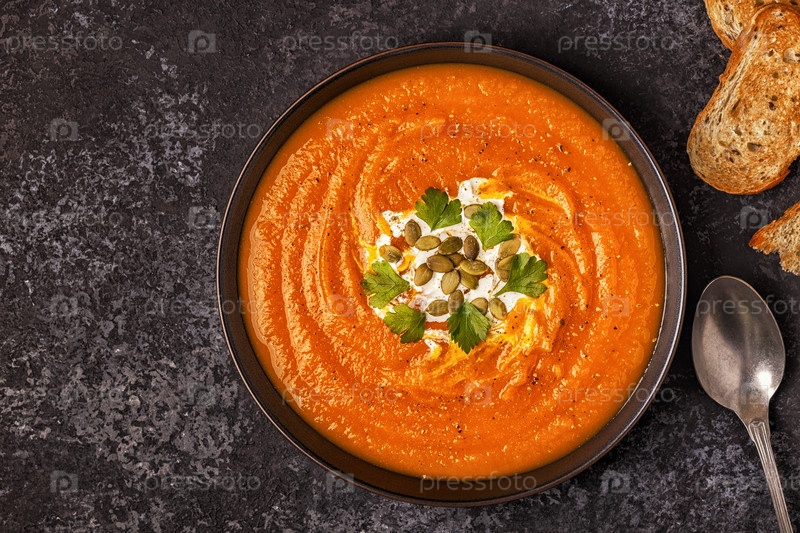 Тыквенно-морковный суп со сливками, семечками и петрушкой